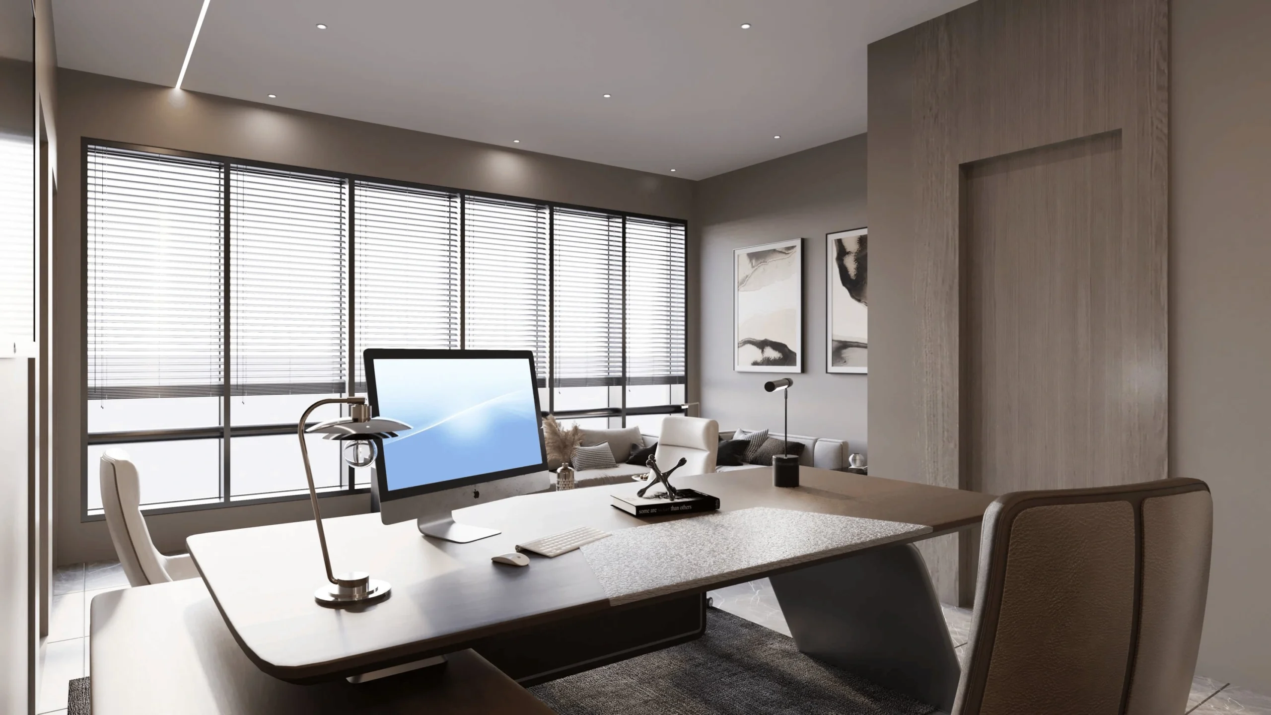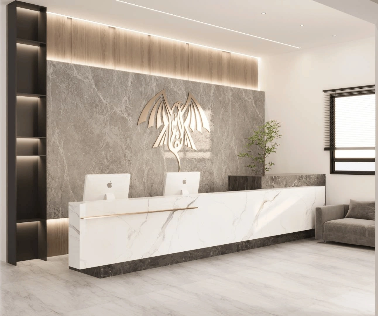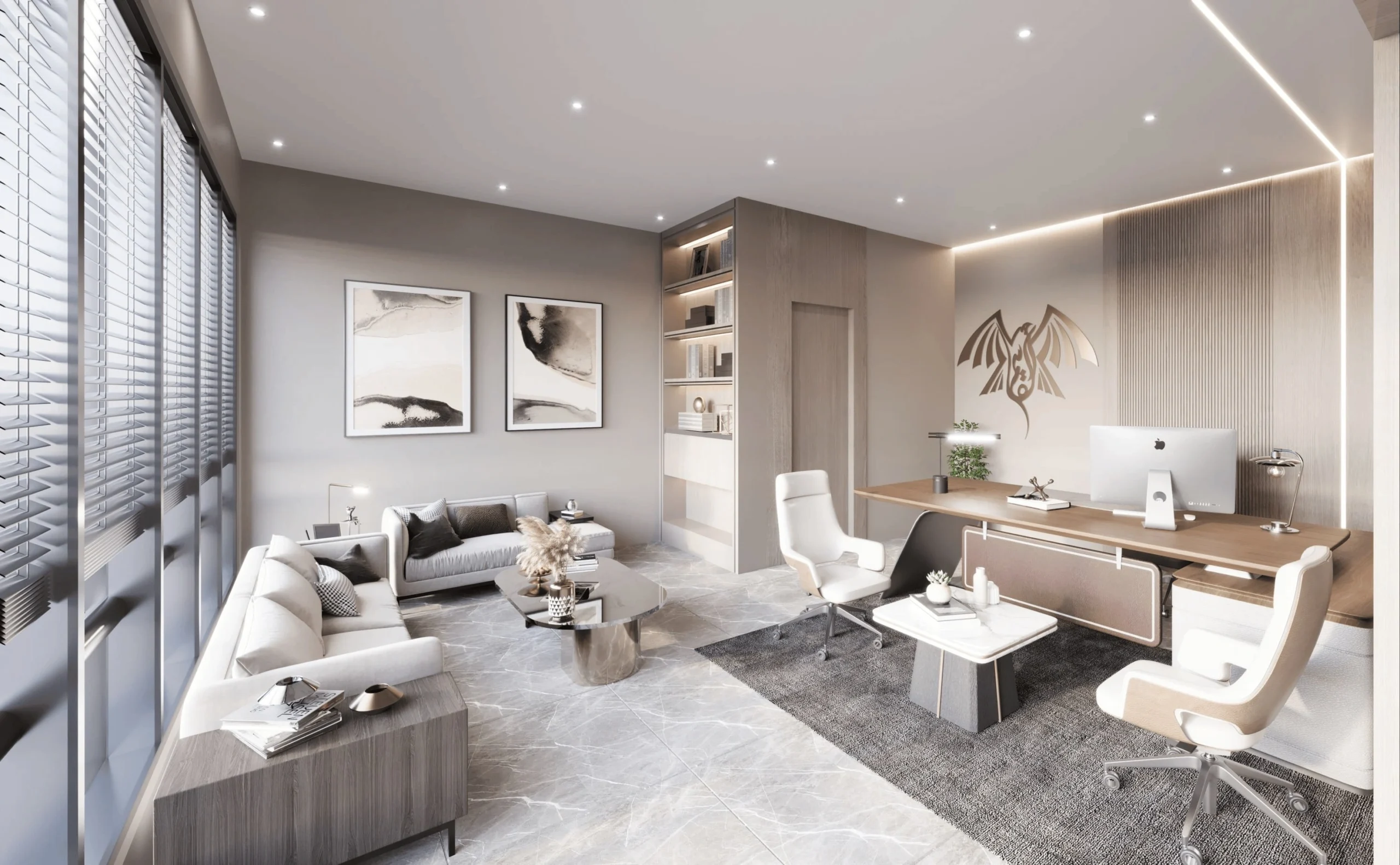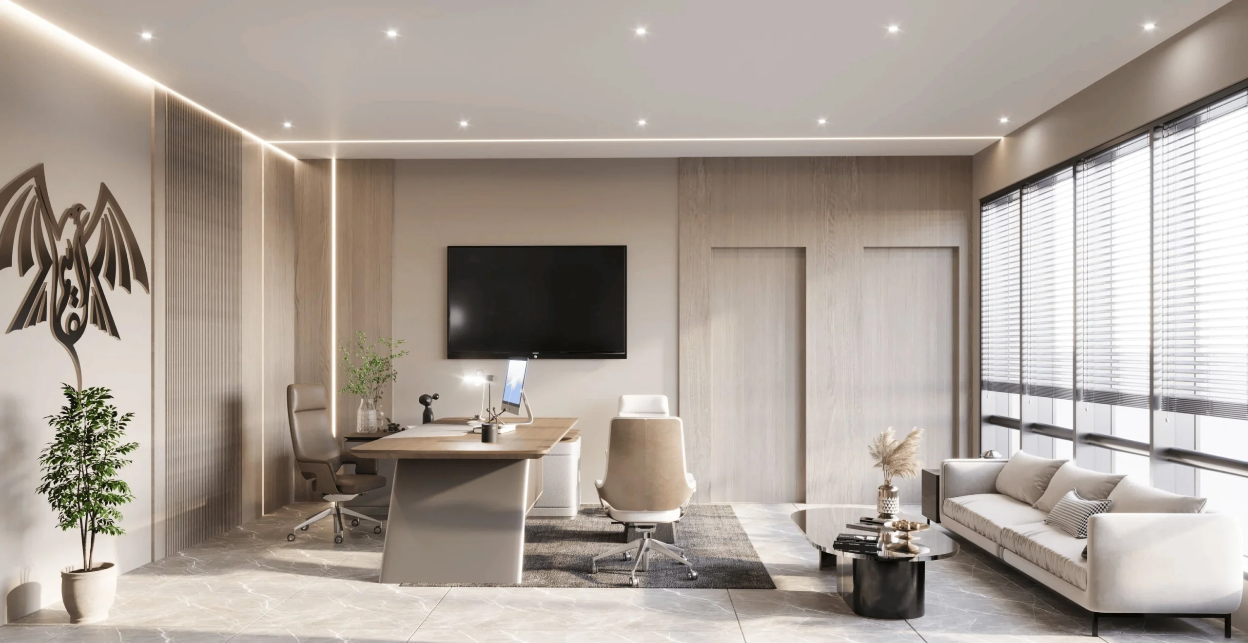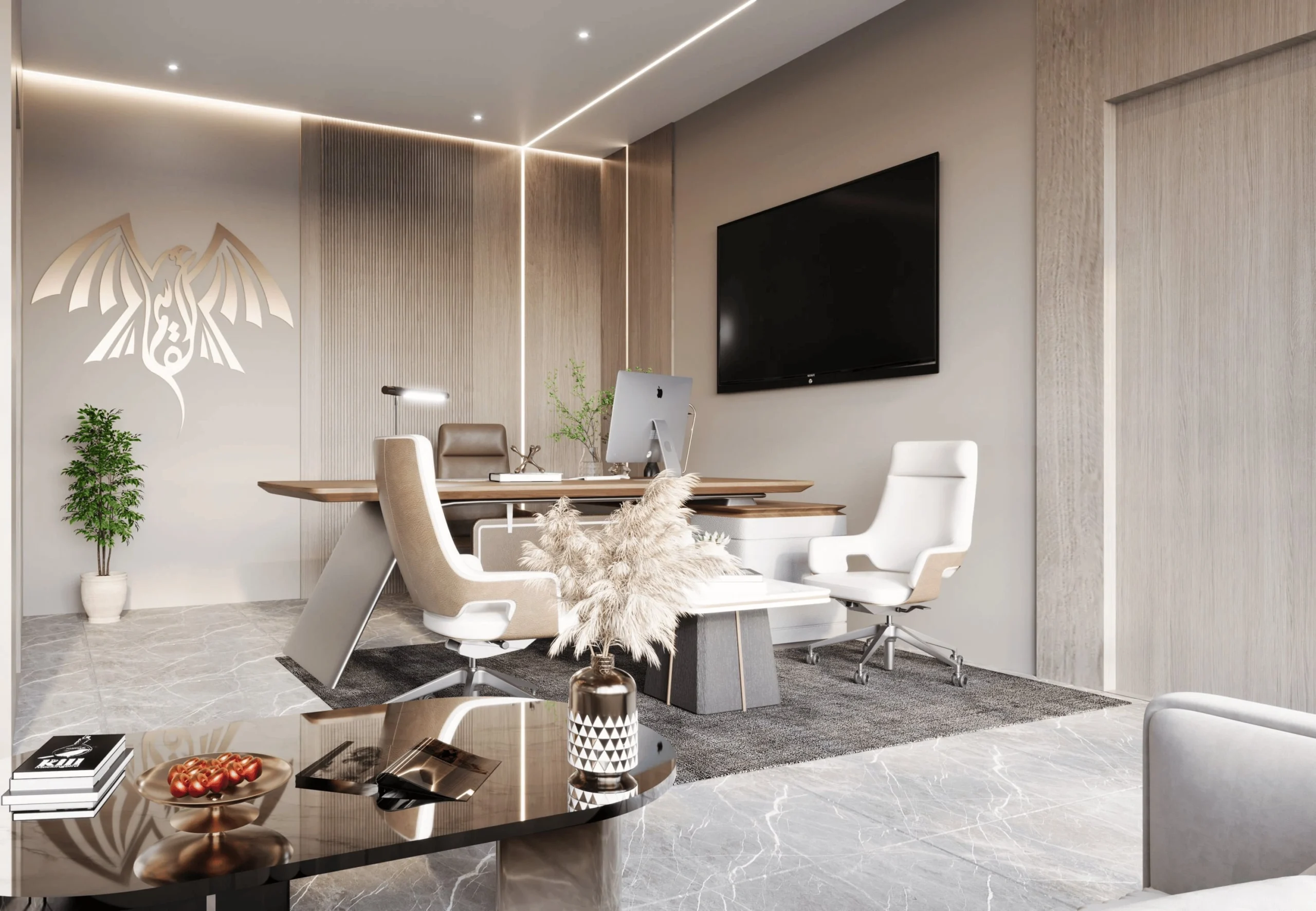 صممنا مكتباً راقياً باستخدام مواد فاخرة مثل الرخام والزجاج والخشب. أضفت لوحة الألوان المحايدة مع لمسات ذهبية وداكنة اللون لمسة فاخرة. شجّع التصميم المفتوح على التعاون، بينما تميزت المكاتب الخاصة بحواجز زجاجية عازلة للصوت لضمان السرية. كما أكملت الإضاءة الذكية والأثاث المريح وعناصر الديكور الراقية الأجواء الراقية.